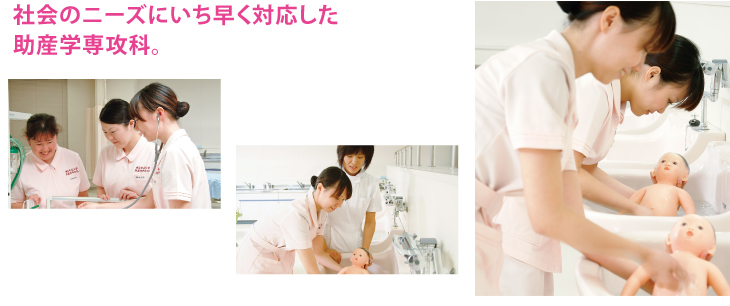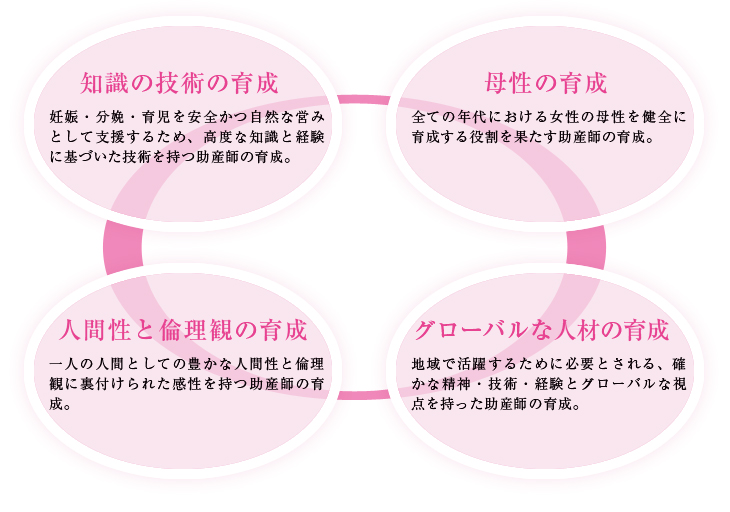 妊娠・分娩・育児を安全かつ自然な営みとして支援するため、高度な知識と経験に基づいた技術を持つ助産師の育成。