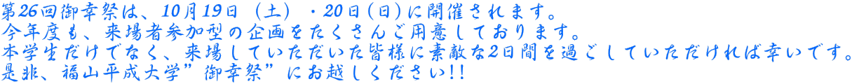 第26回御幸祭は、10月19日(土)・20日(日)に開催されます。 今年度も、来場者参加型の企画をたくさんご用意しております。 本学生だけでなく、来場していただいた皆様に素敵な2日間を過ごしていただければ幸いです。 是非、福山平成大学”御幸祭”にお越しください福山平成大学”御幸祭”にお越しください!!