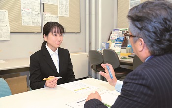 クラス担任教員を中心に、各学科の就職委員、キャリアカウンセラー、ジョブサポーター、並びに、就職課の職員が、学生一人ひとりの話をじっくりと聞き、最新の情報やノウハウなどを提供するとともに、学生の希望と適正に応じた指導・助言を行います。また、学生からの要望に応じて、履歴証・エントリーシートの添削や面接指導等にも対応しています。その結果、多くの学生が自信をつけて本番に臨んでいます。