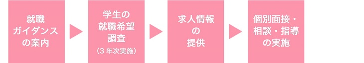 - 学生個々人に対応したデータに基づき、きめ細やかな就職指導を行い、高い就職率を確保する。