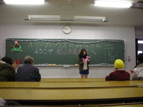 「福祉学科では12月18日、近くの高齢者グループホーム「オリーブハウス」から9名の方をお招きし、恒例のクリスマス交流会をしました。今年は学生による体操やマジック、バルーンアート、踊りのほか、劇「マッチ売りの少女」ではオリーブハウスの職員の方にも飛び入り出演していただき、学生手作りのクリスマスカードの贈呈で幕を閉じました。雨の中を来ていただいた皆様、本当にありがとうございました。(文責大深)」