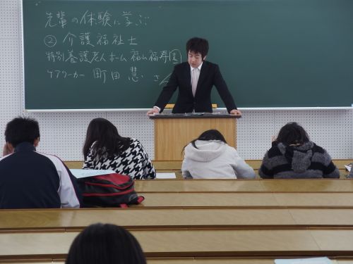 今回1年生を対象に福祉の仕事について話をしてくれたのは特別養護老人ホームに勤務するケアワーカーの先輩でした。