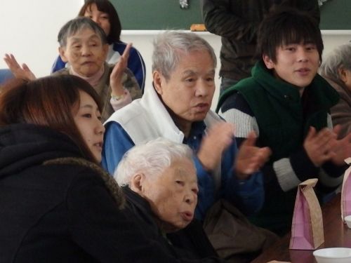 12月17日(水)「ボランティア活動演習」の授業の一環として、大学近くの高齢者介護施設オリーブハウスから10名の利用者の方と3名のスタッフの方を大学にお招きし、1年生40名と交流会を開催しました。当日はこの冬一番の寒波襲来で、どうなることかと思いましたが、和やかな雰囲気の中で身も心も温まり、学生たちにとってもとてもいい体験学習となりました。