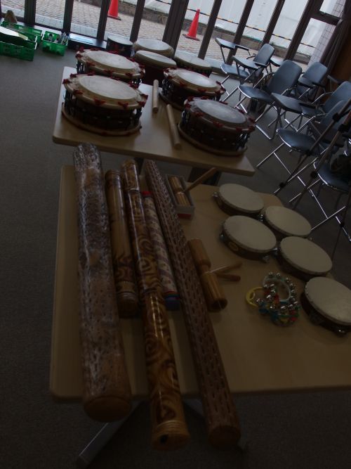 手前の長い筒はレインメーカーという楽器です。サラサラと雨のような美しい音が出ます。何から出来ていると思いますか。