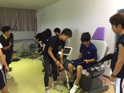 7月26日のオープンキャンパスでは、石橋学科長による学科紹介と模擬講義「スポーツ傷害と予防」に始まり、若井講師による様々なサッカーの体験と、黒坂講師による姿勢の測定が行われました。