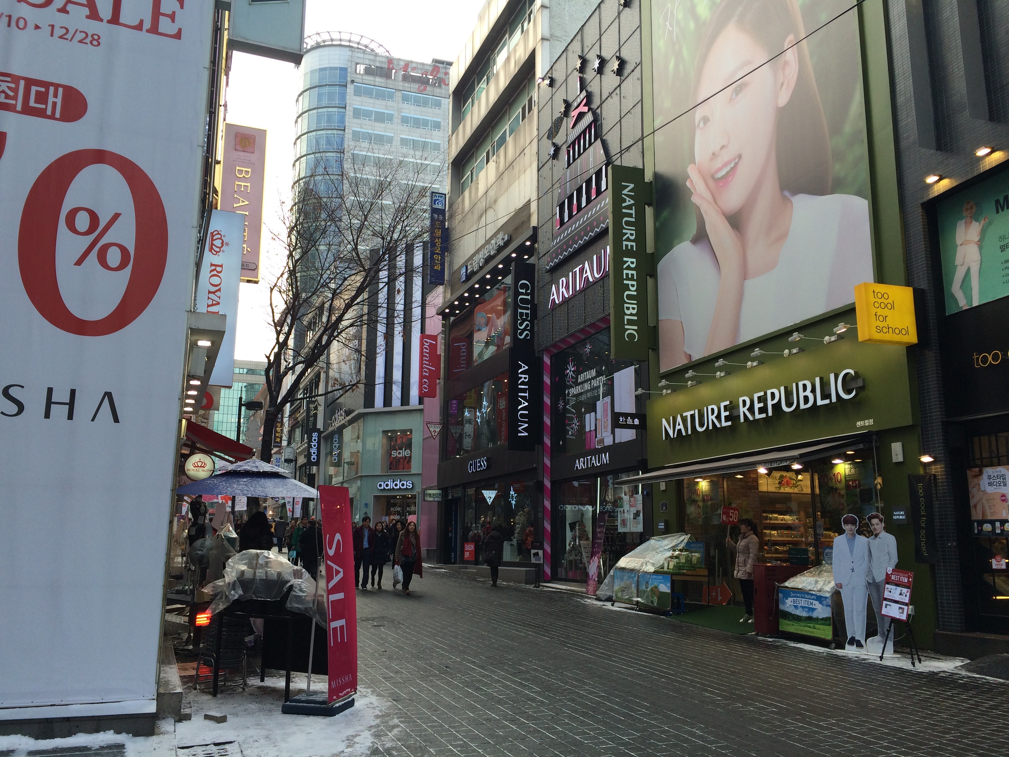 韓国 ソウルの明洞(ミョンドン)の街並み。化粧品店や衣料品・雑貨・飲食店などが無数に並んでいます。