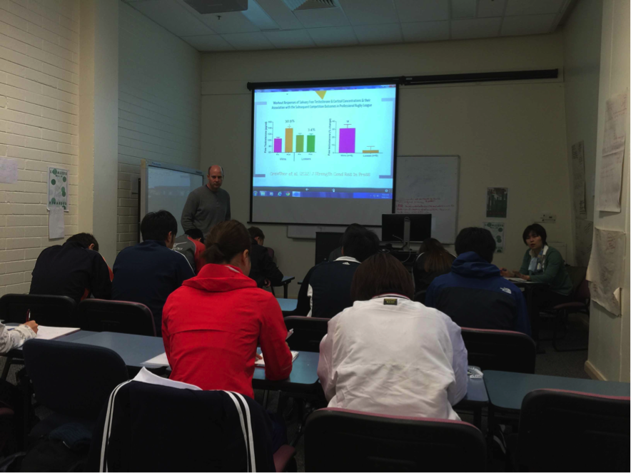 各分野で活躍している専門家や大学の教授からレクチャーを受けました.更にオリンピック選手たちを養成する施設Australia Institute of Sport(AIS)では本学の学生のためだけにプライベートツアーを組んで貰い,普通の人が入られないような選手の強化の様子や研究室を見学し、専属トレーナーによる運動性能のチェック等もしてもらいました.このAISは日本の国立スポーツ科学センター(JISS)のモデルとなった施設です.