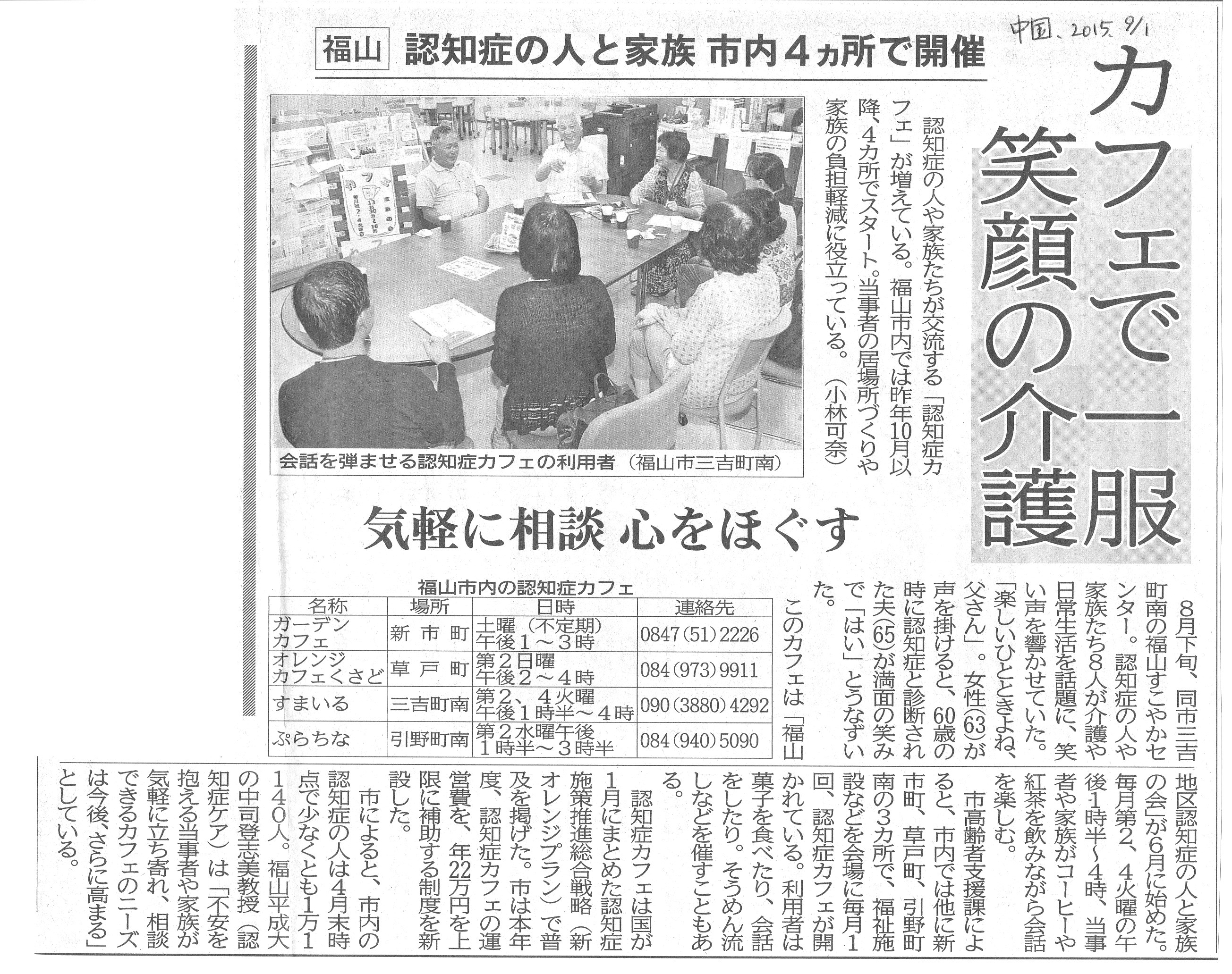 大変賑やかでした。きっと、9月1日に、下記にあるように「中国新聞」が福山市の 認知症カフェを取材して、記事にして下さったからだと思っています。参加さ れた方は、希望者一人ひとり丁寧なフットケアを受けることができて癒され、とても満足 されていました。