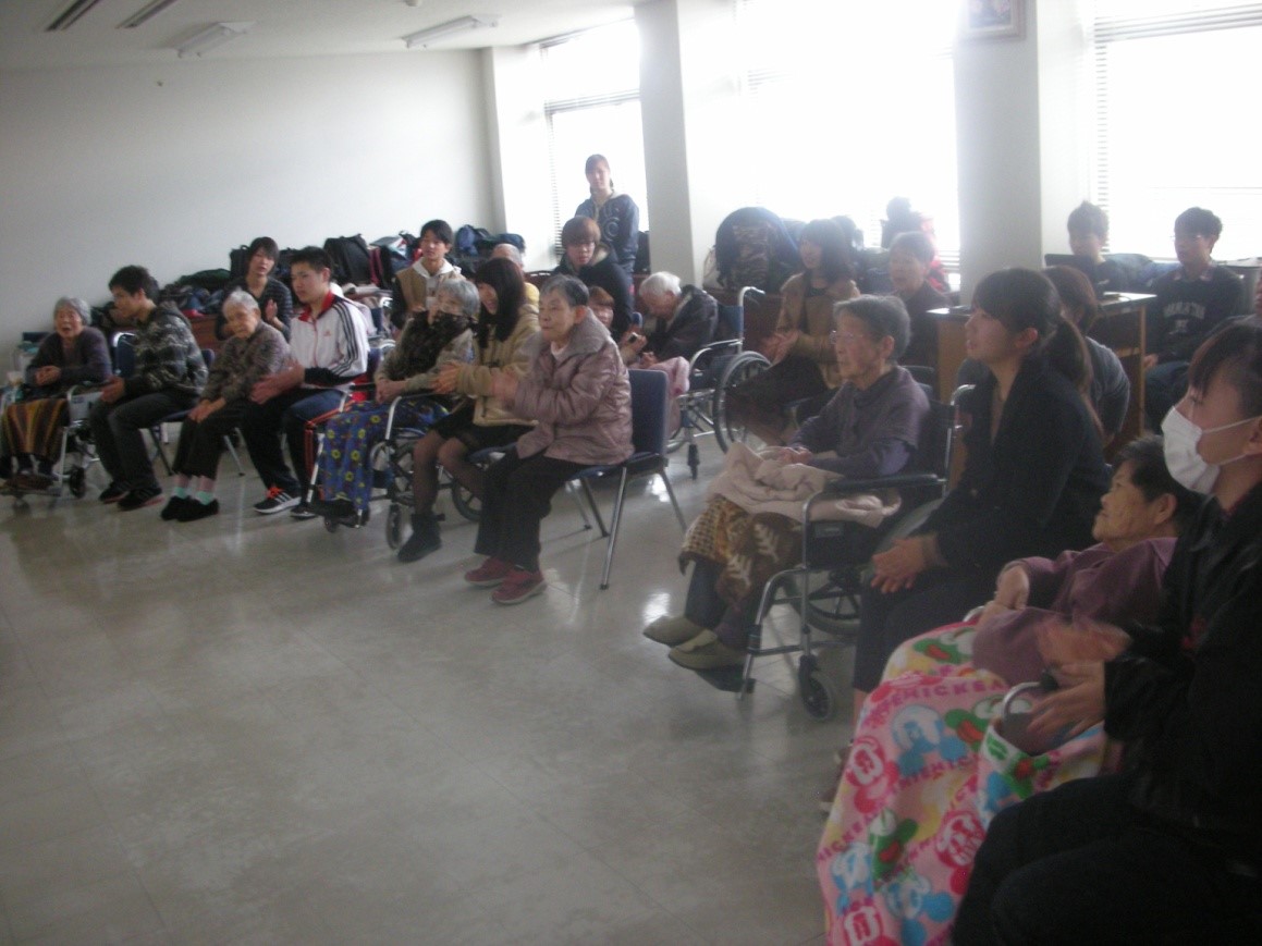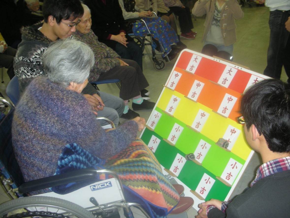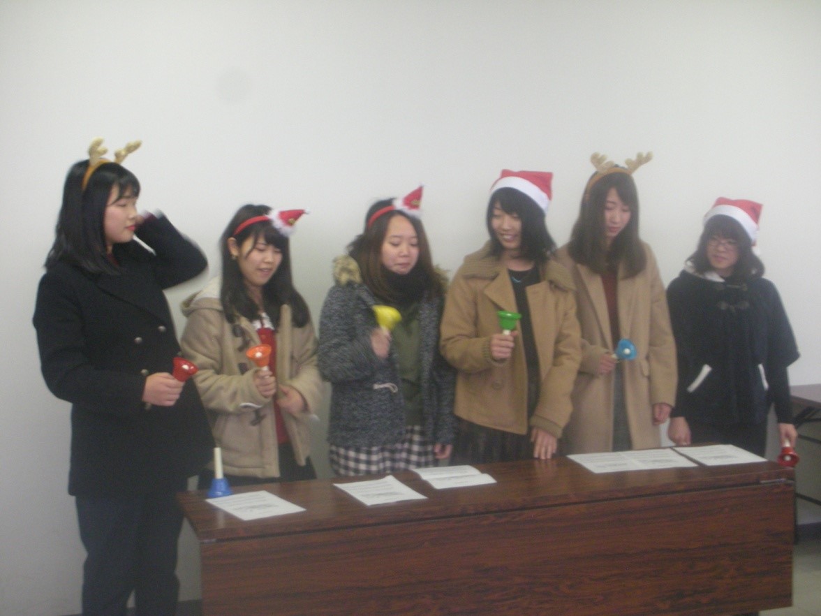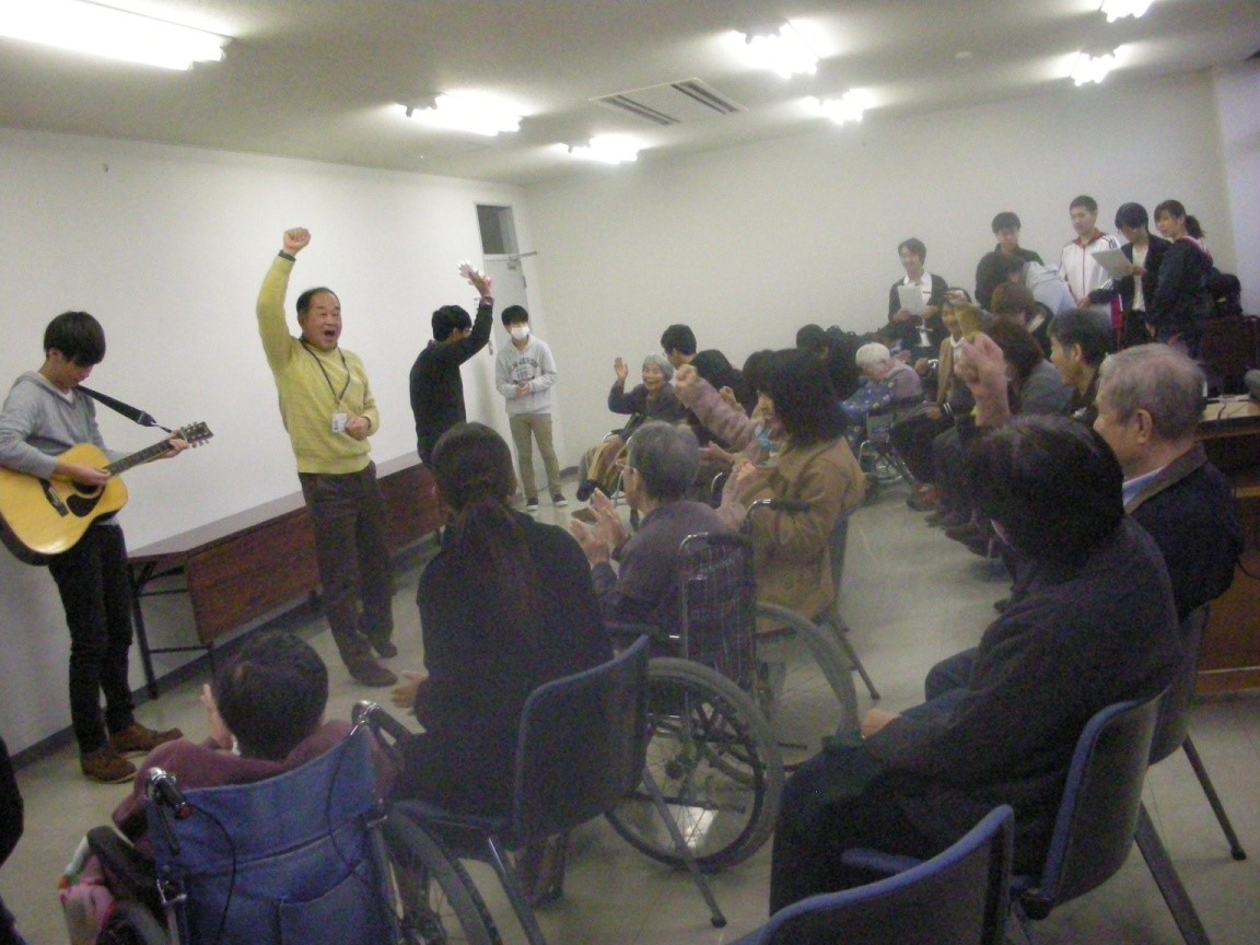 12月16日、年内最後の「ボランティア活動演習」の授業で、今年も恒例の「高齢者とのお楽しみ交流会」を行いました。お招きしたのは、大学近くの高齢者介護施設オリーブハウスの12名の利用者の方と4名のスタッフの方です。1時間足らずの短い時間でしたが、イベントを企画運営する貴重な体験をさせていただきました。