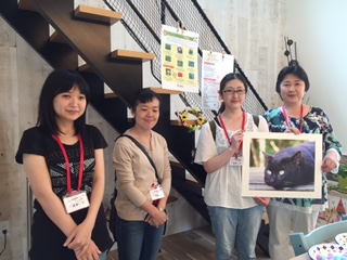 今回は、福山市内の動物愛護のNPO法人らと連携して、イヌやネコの適正飼育や動物殺処分0(ゼロ)を目指した啓蒙活動を行いました。7月31日(日)に福山市緑町で開催された「癒しと猫の写真展」に、学生たちはボランティアとして参加しました。