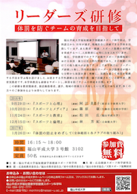 健康スポーツ科学科では、「リーダーズ研修 〜体罰を防ぐチームの育成を目指して〜」と称し、学内部活動のリーダー及び指導者が様々な分野から体罰を深く理解し、