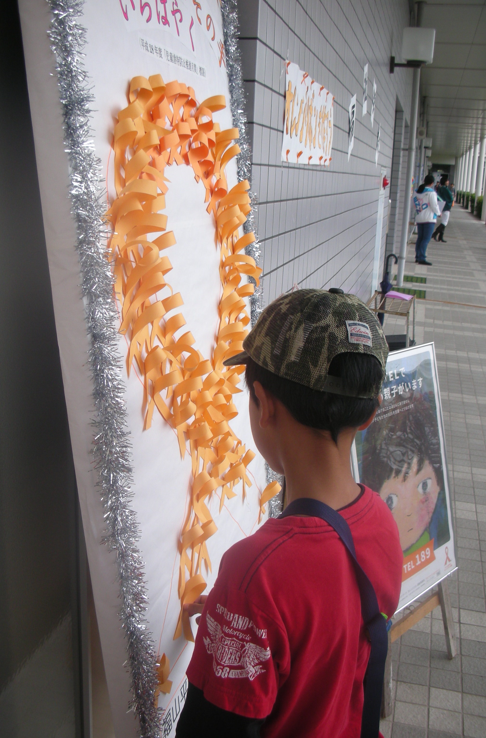 ①子どもたちと一緒にオレンジリボンを作りました。