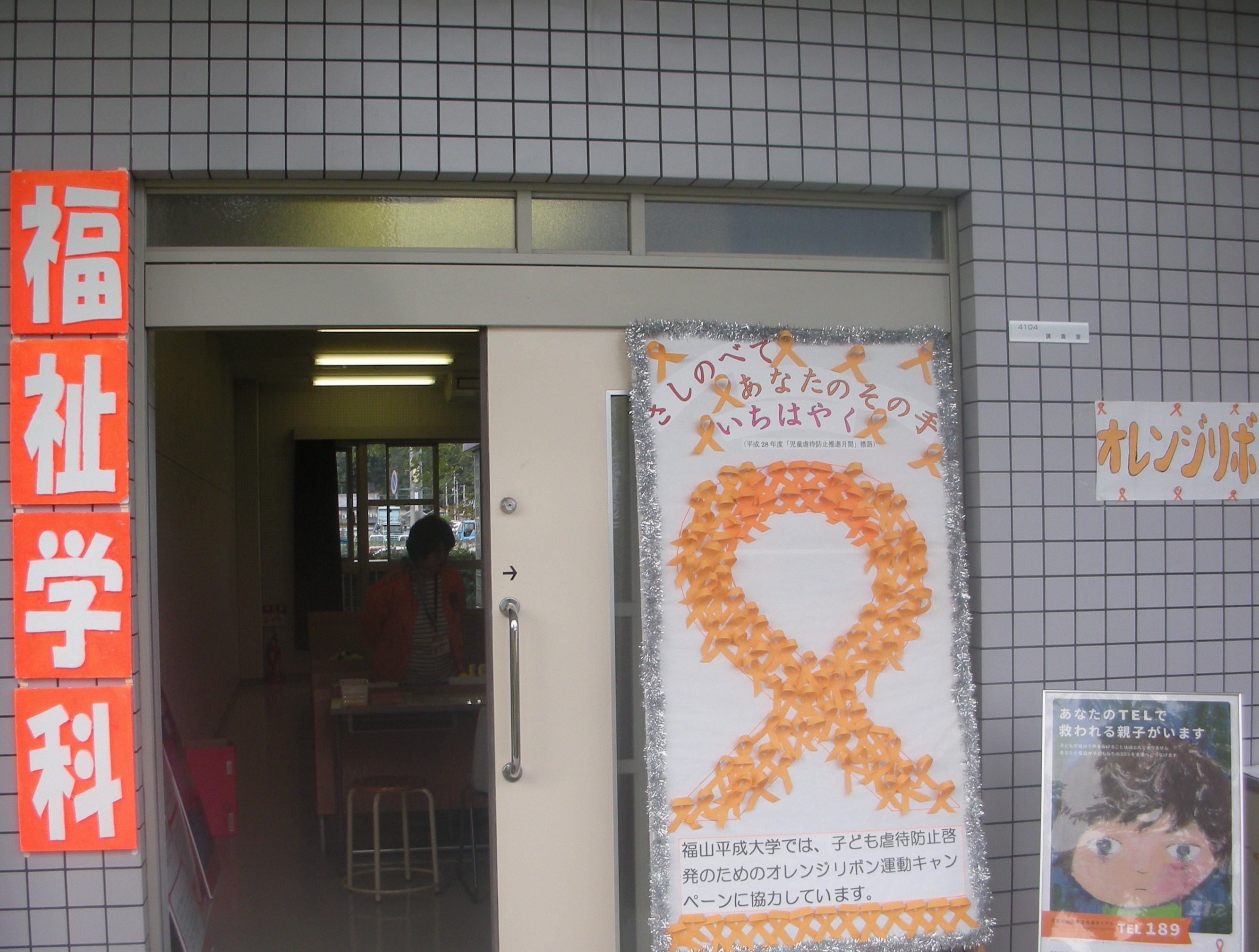 福祉学科では2013年度につづき今年度も御幸祭で児童虐待防止の「オレンジリボン運動」を行いました。今年はこども学科、看護学科との合同企画です。