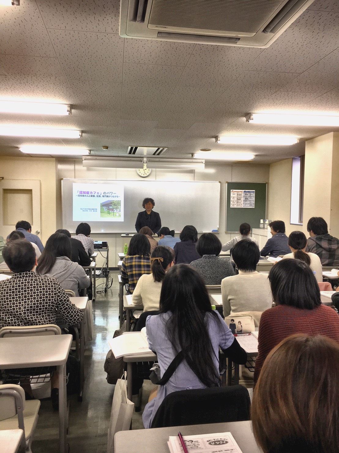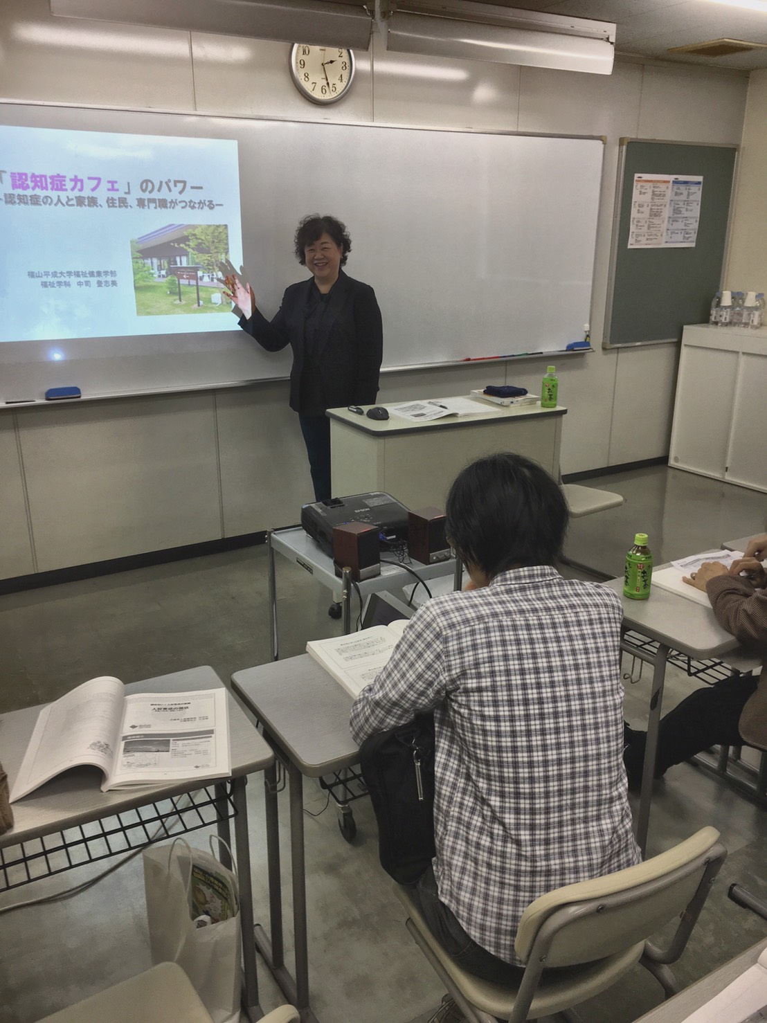 講義の中では、これまで2年間福山市新市町で取り組んできた認知症カフェ「ガーデンカフェ」と、今年10月から御幸町で始めた「平大認知症カフェ」の話をしました。前者はイギリス型に近いカフェ、後者はオランダ型に近いカフェと紹介し、二つのカフェの違いや共通点を説明しました。どちらの認知症カフェもたくさんの人が集まって下さっていることを紹介しましたら、授業後に私もやってみたいと質問に来て下さる方が数人あり、役目を果たせたのかなと思いました。(中司登志美)
