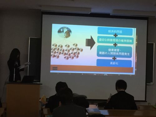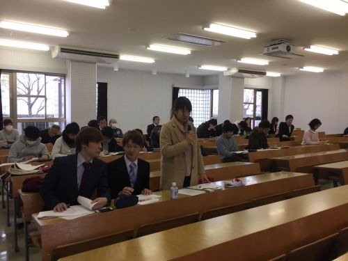 4年間の集大成になる研究テーマとなるように、テーマ選びにもずいぶんと苦労したようです。学生自身の身近にある家族介護をテーマにしたり、これまで大学で学んだ授業や実習での体験を活かしたりと、さまざまな視点が示されました。障害児の利用するサマーキャンプ、大学周辺地域の地域コミュニティづくり、福山を舞台にした百姓一揆、介護と子育てを同時にするダブルケアと、学生一人ひとりが卒業研究を完成させるために多くの予備学習をしていたことも発表を通じて分かりました。