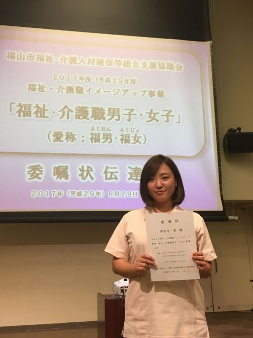 福山市福祉・介護人材確保等総合支援協議会では福山市内福祉・介護職イメージアップ事業の一環として、福祉・介護現場で「やりがい」「情熱」「喜 び」などを持って,法人・事業所等で働かれている『福祉・介護職男子・女子』(愛称:福男 ふくだん ・ 福女 ふくじょ )を募集していましたが、このたび本学の卒業生が2名選ばれましたので報告いたします。
