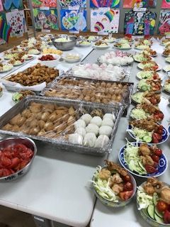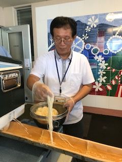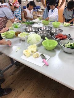 「すずこい亭」のメニューは①鶏肉の唐揚げ、②野菜サラダ、③流しそうめん、④おにぎり、稲荷ずし。全部を町内の高齢者ボランティアさんや食生活改善推進員の皆さんがマンツーマンで子どもたちに調理指導をしてくださったので、みんなで作ってみんなで美味しく食べることができました。おにぎりと稲荷ずしの食材は福山フードバンクから搬入されたものです。卒業研究でフードバンクをテーマに取り組んでいる福祉学科4年生の村上誠君が配達してくれて、そのままボランティアに残ってくれました。
