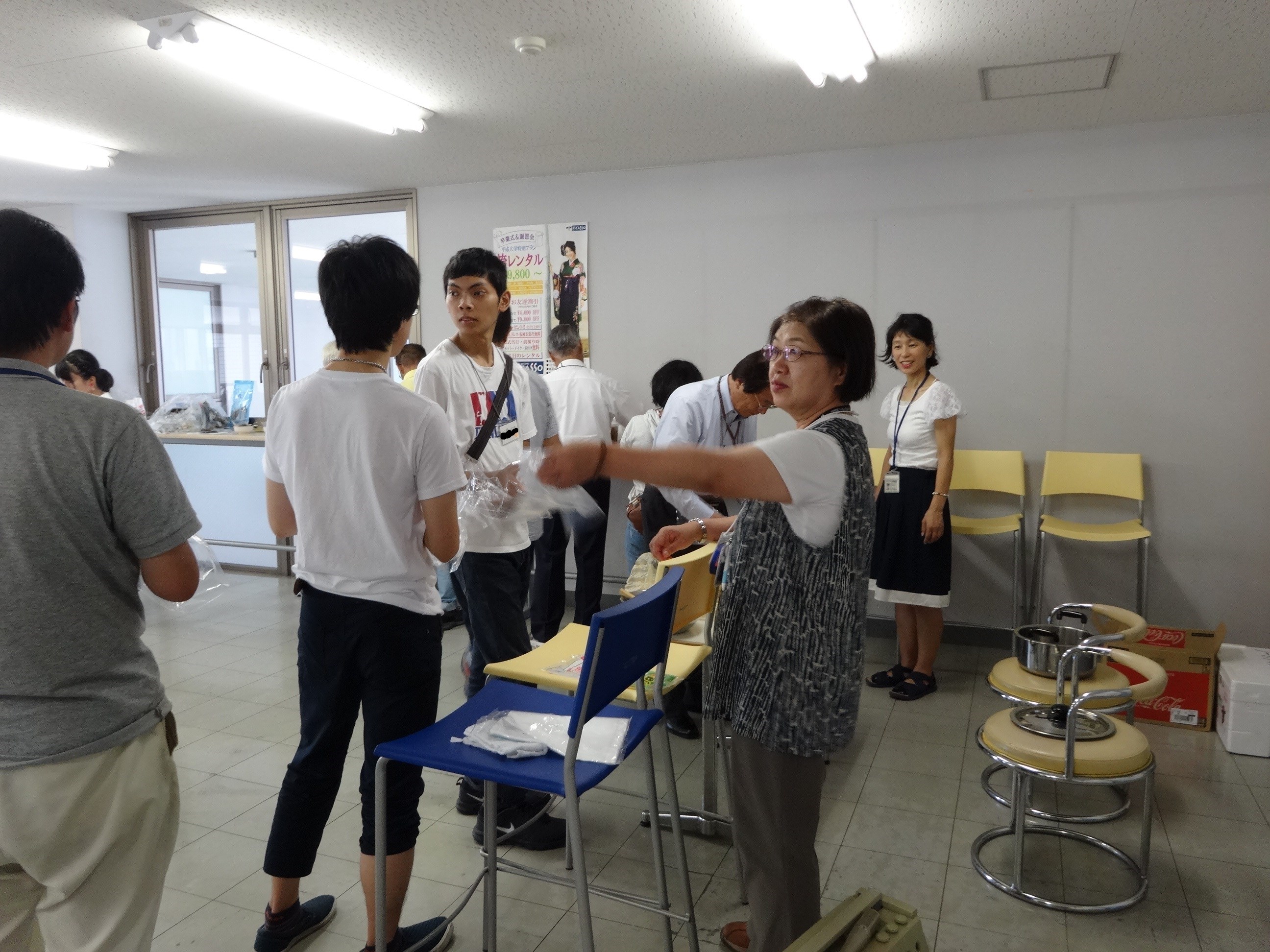 実際の避難所では衛生状態が良くないため、この体験でも参加者はビニル袋を手に巻いておにぎりを握るなどして、普段とは違う体験を行いました。