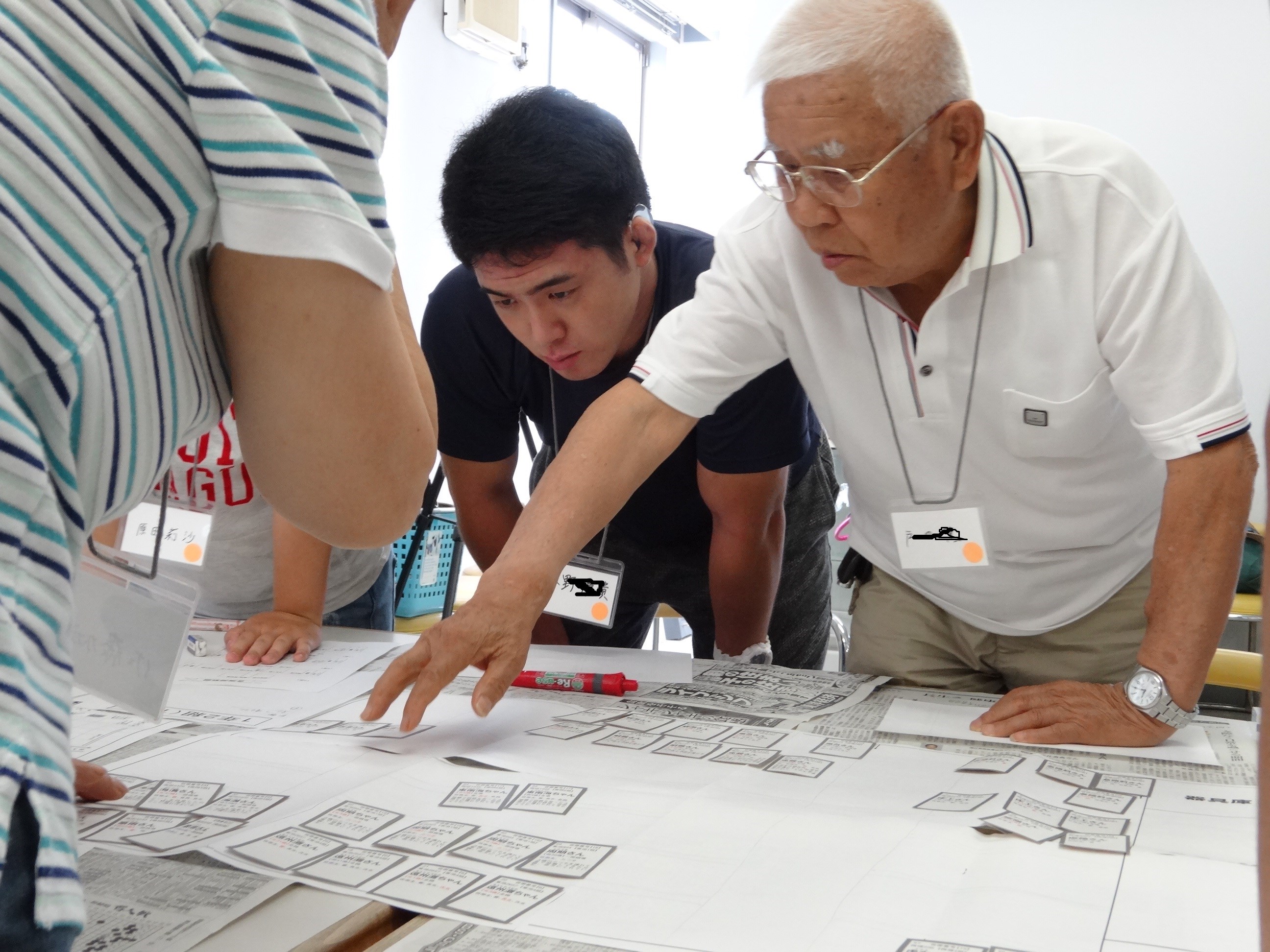 参加者は3つのグループにわかれ、自己紹介を行った後、2時間ほどかけて避難所運営ゲーム(HUG)を行いました。HUGは、参加者が地域の防災担当者となり、地震が起きた後、次々に避難してくる避難者に対して、どのように避難所(小学校の体育館・教室)を運営していくのか、チームで相談しながら進めていくゲームです。