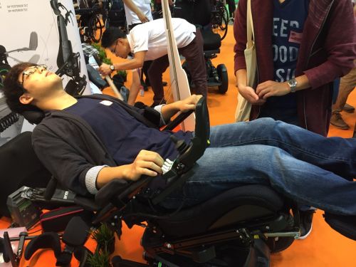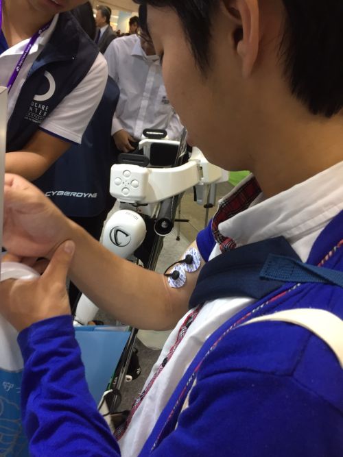 学生らはそれら機器のデモンストレ-ションを体験したり、業者の説明を聞き入ったりしました。特に学生が気になっていたのが、介護ウェアでした。自分たちの介護実習にも関係するので、要望を業者に伝え、どんなものがあるか説明を受けていました。他にも、車イスに乗ったまま立位をとる機能。ティルト機能(安定した座位が保持できる機能)をプログラミング制御できる車イス。話題となっているロボットスーツHALも体験してみました。