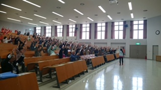 10月14日(土)12:30~15:30は1周年を記念して、いつものカフェに加え記念講演会を行いました。講師は、広島市にお住まいの認知症当事者の竹内裕さん(67歳)。本学福祉学科教授で主催団体の平大認知症カフェ連絡協議会副代表を務める私中司がインタビューをし、それに答えるという形の講演会でした。163人の参加者に聞いて頂きましたが、アンケートによると「勇気をもらった」「具体的でわかりやすかった」等大好評でした。福祉学科の学生達はお揃いのオレンジジャンパーを着て大学の門に立ち、来客者のご案内係を頑張りました。