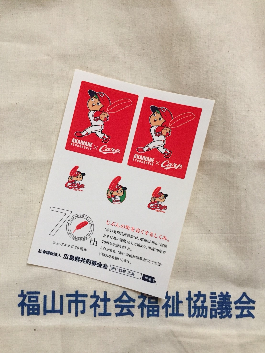 広島県では、赤い羽根共同募金にご協力いただいた方には、赤い羽根以外にも「赤い羽根×カープ コラボステッカー」を配らせていただいてます。ところで、福祉学科の学生があんまり写真に写ってないと心配されているかもしれませんが、ご安心ください。ここだけの話し、学生たちはキャラクターとなってPR活動を頑張っているのです!本当にお疲れ様でした!