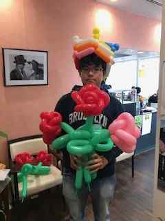 2月のこの回は本学の担当の月でした。福祉学科3年の妹尾祐哉君に協力を依頼して、バルンアートパフォーマンスを見せてもらいました。妹尾君が作った作品は、奪い合いになるほど人気で、参加者の皆さんが持って帰られました。また妹尾君の指導で、全員でバルンを使って薔薇を作りました。風船が割れるのではないかとドキドキしながらも、笑顔の絶えない楽しい時間を過ごせました。