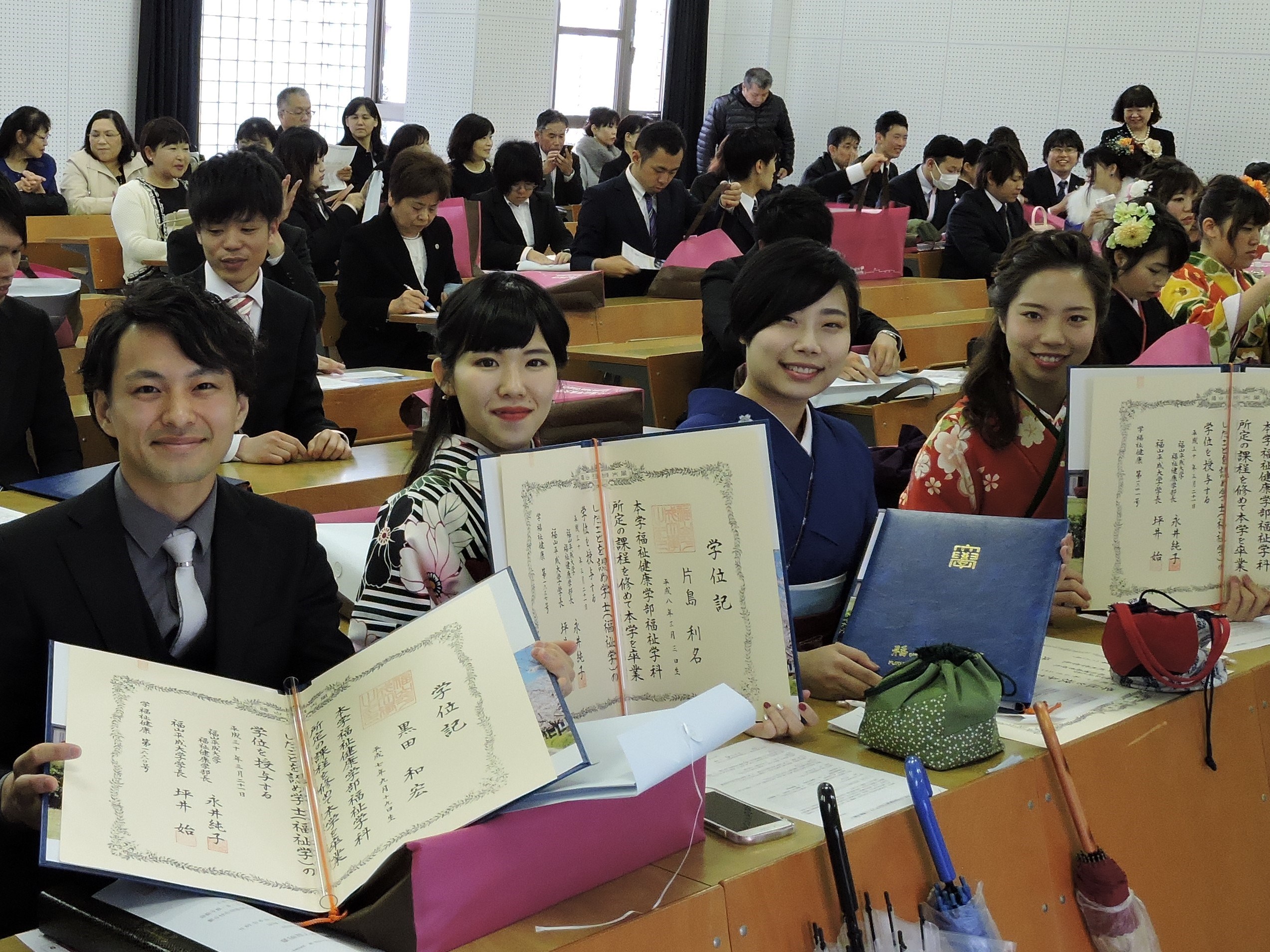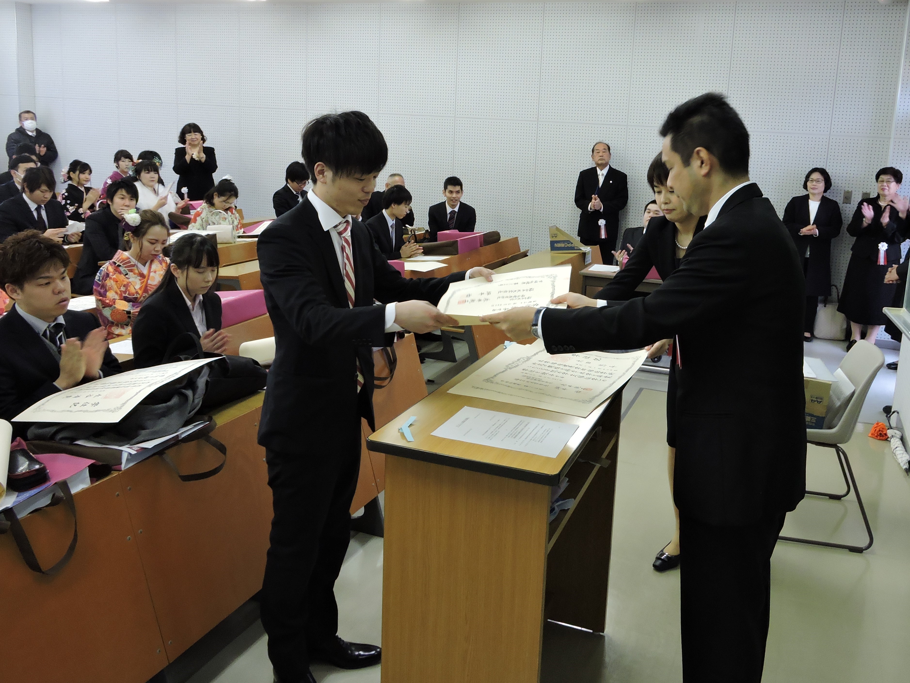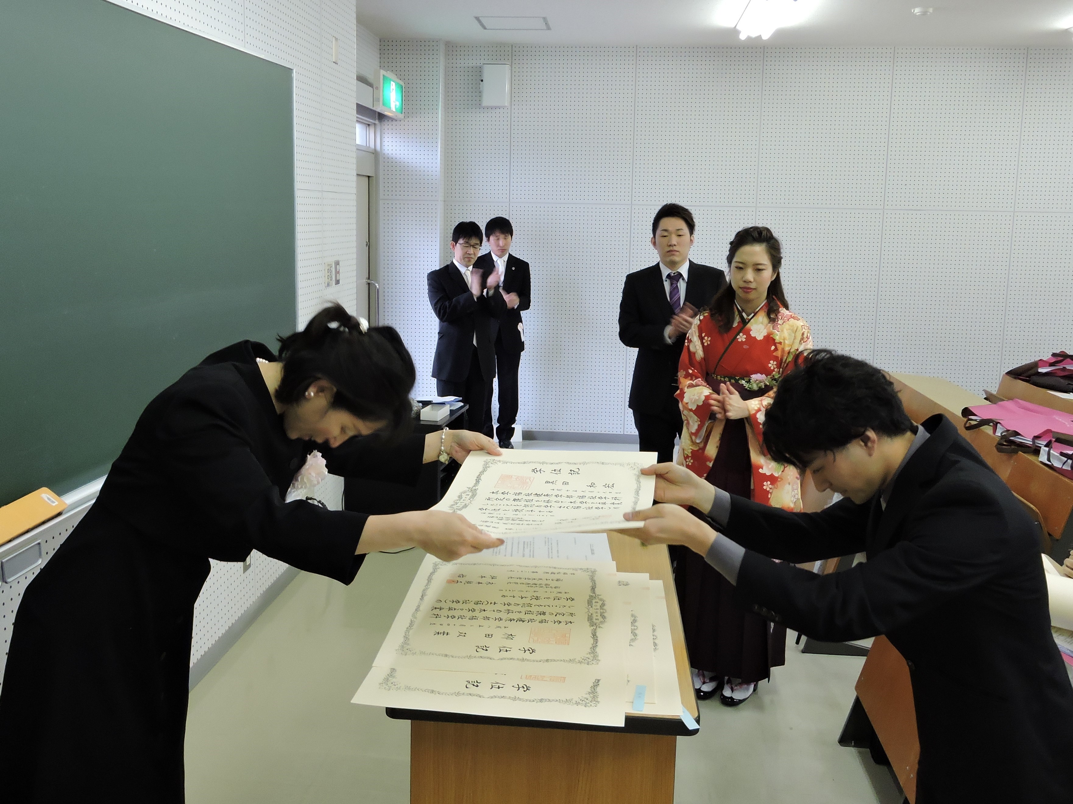 式終了後、福祉学科におけるゼミ教員から学生一人ひとりに授与する様子をご紹介します。
