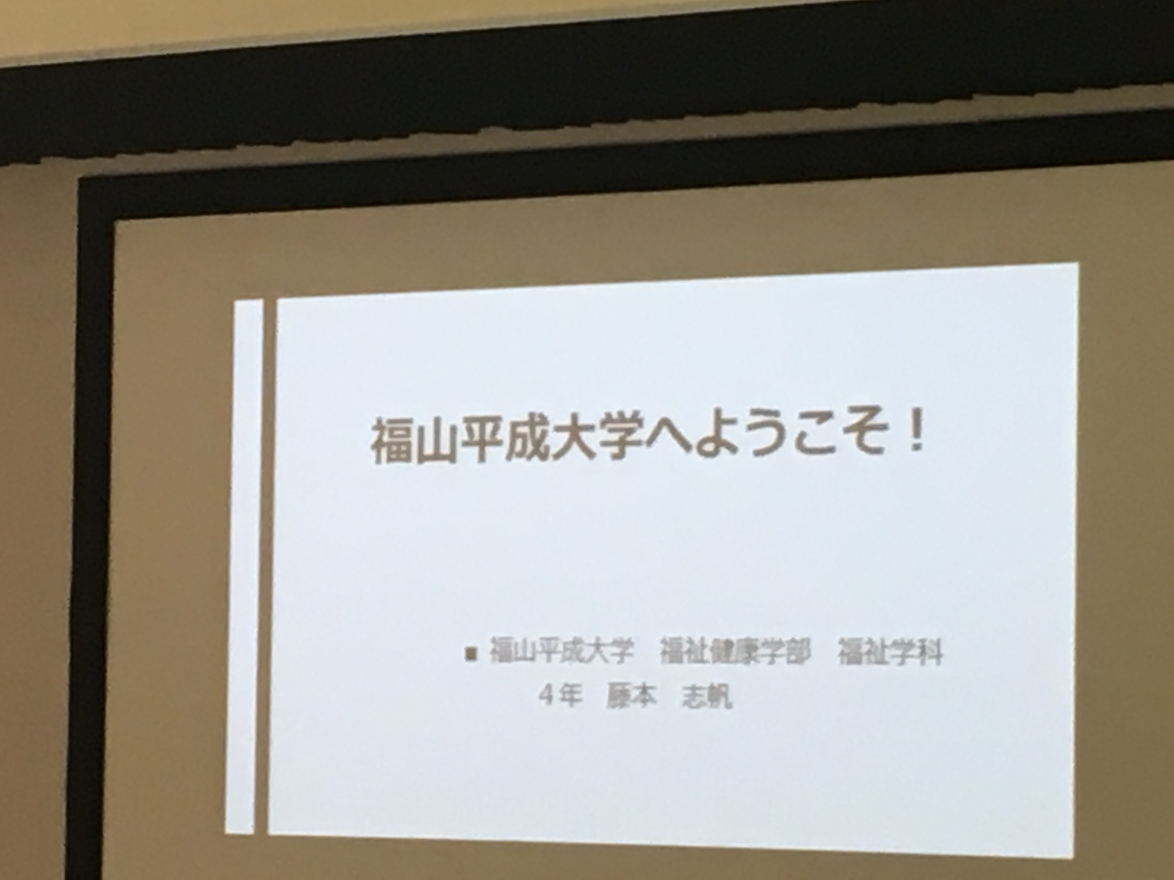 午前中の全体説明では福祉学科4年生の藤本志帆さんが大学への歓迎挨拶を行ないました。