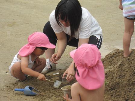 子どもたちが園庭全体を使って泥や水に親しむ活動を楽しんでいました。