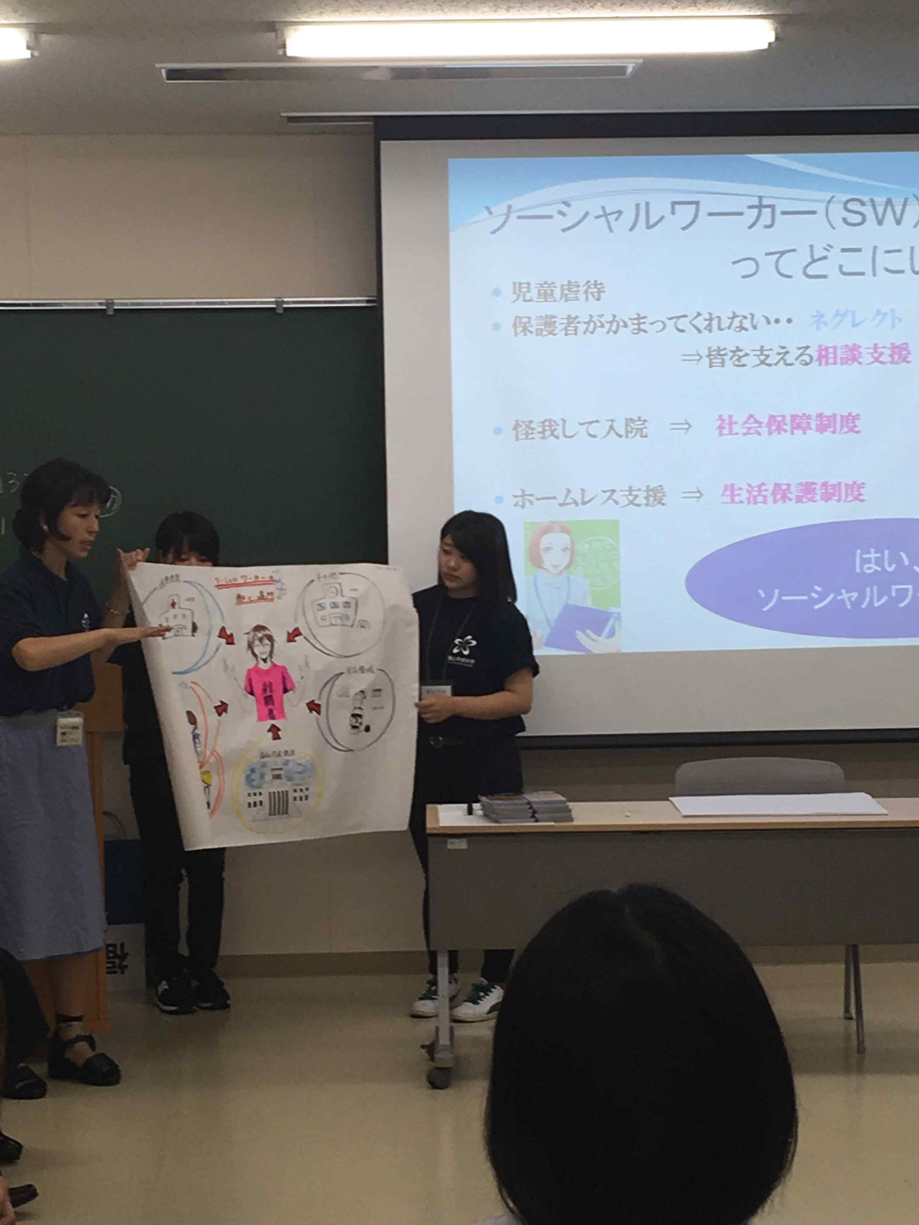 の二つの模擬講義をメインに福祉学科での学習内容や、ソーシャルワーカーやケアワーカー等の将来の仕事のイメージについて、参加者と学生が共に学びました。