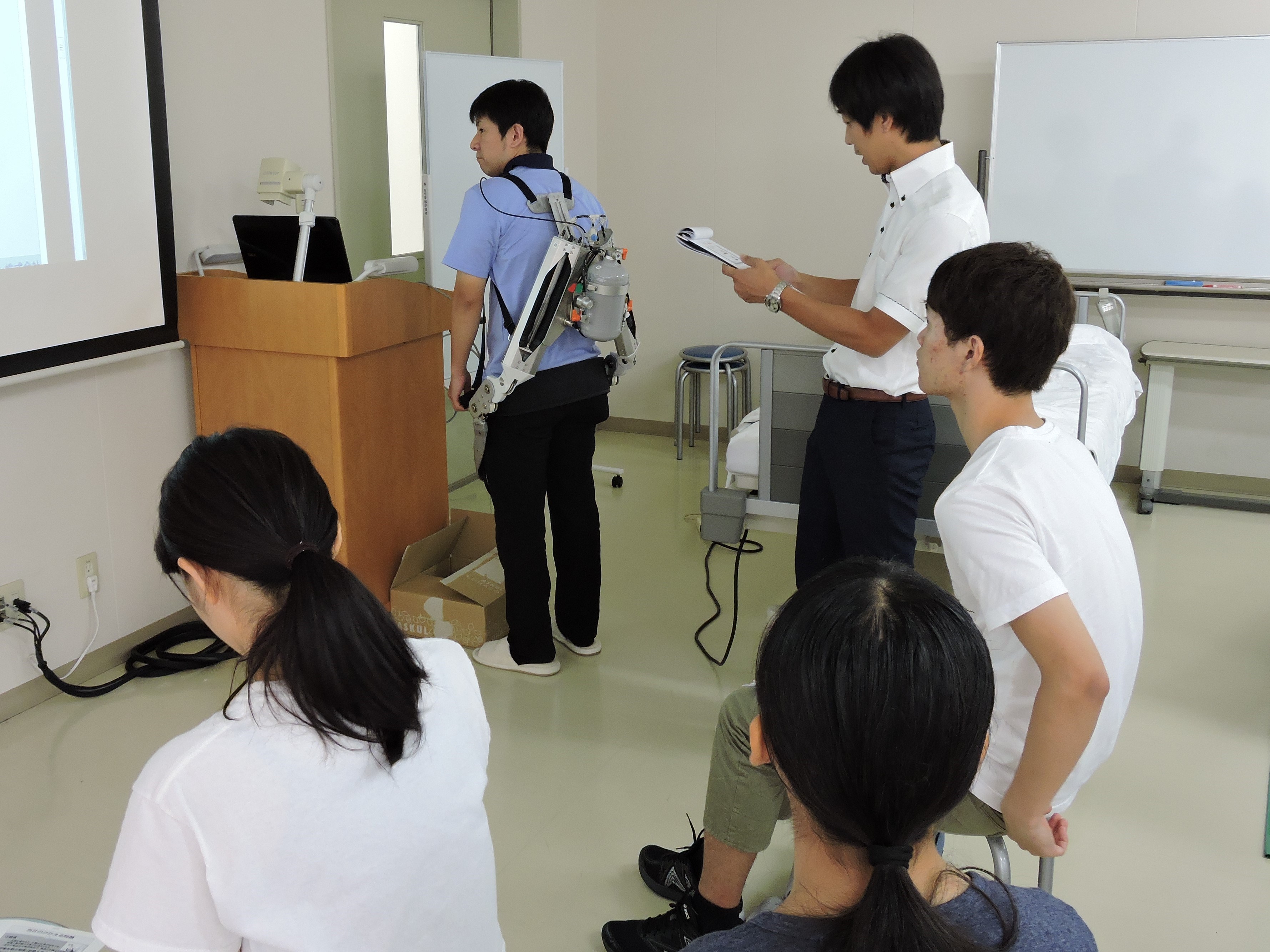 実際に、マッスルスーツ使用時の介護を受ける側の体験と、介護をする側の体験を行いました。