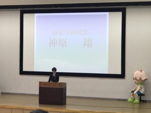 3月1日の就職活動解禁日に合わせ,270名の学生90名の教員も参加し就職活動出陣式が開催されました。経営学部では、経営学科代表として、3年の神原 翔 君が就職活動に対する意気込みを堂々と述べてくれました。 3月1日から就職活動解禁です!ここが頑張りどころ。将来のキャリアは自分でしっかりつかんでください!