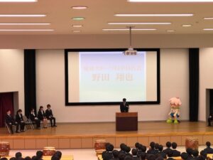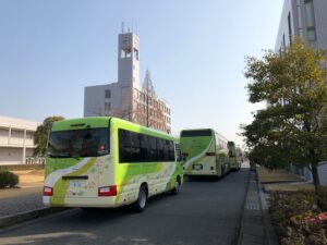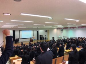 福山平成大学では,就職解禁日の3月1日(金)に3年次対象「就職出陣式」が行われました。健康スポーツ科学科では,野田翔也くんが学科を代表し決意表明を述べました。 今年度は,健康スポーツ科学科4年次生全員,就職が決まり卒業していきます。3年次生もこれに続いて,それぞれの自己実現へ向け良いスタートダッシュをしてもらいたいと思います。 出陣式後には早速バスに乗り込み,教職員が見送る中,広島で開催される合同企業説明会へ向かいました。ガンバレー!