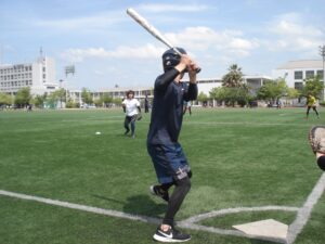 気持ち良い五月晴れのもと、ソフトボールの1回戦は、なんと昨年に引き続き、こども学科同士の戦い。