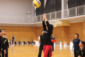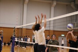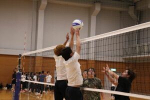 教職員チームとの闘いのときには、女子バレーボール部の顧問でもある永井健康福祉学部長が強い味方になってくれました。チームの動きの采配をしてくれるなど、プロの指導を受けた彼らは破竹の勢いで進んでいきました!