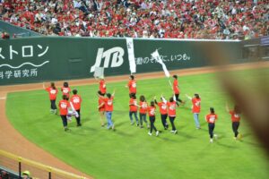 このスペシャルデー企画に際し、福山市から福山平成大学、福山大学、福山市立大学の3大学に依頼があり、福山平成大学からはダンス部部長・こども学科3年の鎌倉さんを始め、部員の皆さんが大観衆の前で、CCダンスを披露し、盛り上げました(カープの赤い帽子を被っているのが、ダンス部部長の鎌倉さん)。
