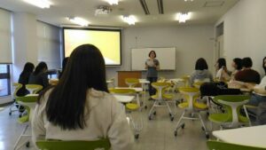 5月15日(水)、韓国施設研修の報告会をしました。4年生3人は韓国の生活や文化について、3年生6人は見学した施設についてパワーポイント資料を作って説明してくれました。