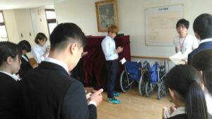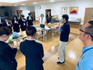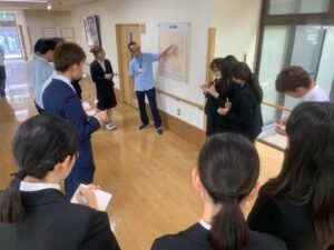 また、通所介護事業所の堀内管理者も丁寧に説明をしてくださいました。通所介護の意義や業務内容、利用目的等についてお話をいただきました。学生からいくつも質問が出てくるなど質疑応答も活発に行われました。直接学生達は、利用者の皆様とふれあうこともできました。