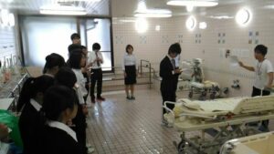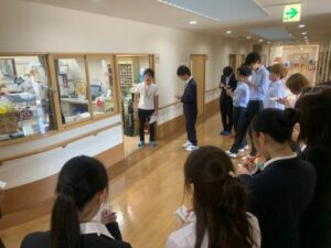 いよいよ、見学ツアーの終わりですが、まとめの時間にもたくさんの質疑応答が行われました。「やりがいは何ですか?」「ソーシャルワーカーとケアワーカーの連携って、どんなことがありますか?」それら質問に対して小林生活相談員らが丁寧に答えてくださいました。そして最後のお礼を1年生の大元葉月さんが述べ、一連のプログラムを無事に終了しました。