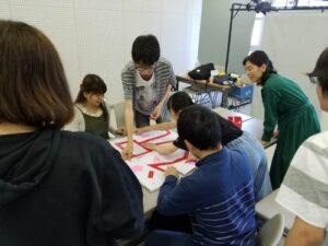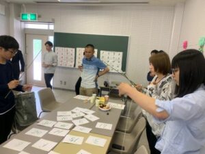 先輩の作った竿を持って、協力し合ってカードを釣っていきます。