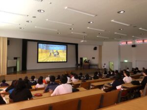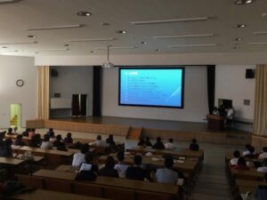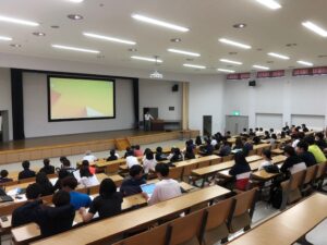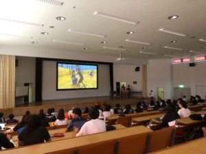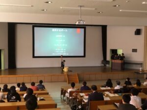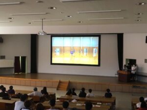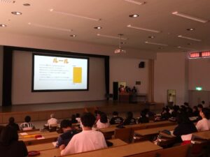 次に,各ゼミで考えたニュースポーツのプレゼンテーションを全体の前で行い全員で審査しました。