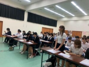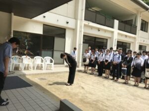 バスに乗って約10分、1年生全員が現地に到着しました。1年生代表の益岡さんから施設職員に向けて本日の見学の目標とともに挨拶を行いました。