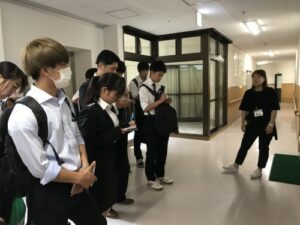 前回の社会福祉法人松風会の特別養護老人ホーム見学に引き続いた見学プログラムでした。福祉学科では、このように地域の社会福祉法人や事業所と連携をとって、学生らに学びの場を提供しています。