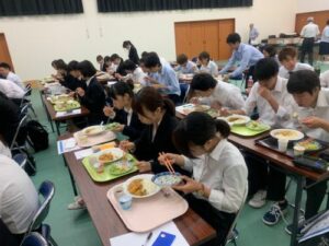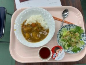 一連の見学を終えてから、学生たちは施設職員の皆さんに質問をしました。時間が足りなくなるほどの質疑応答となりました。ちょうどお昼ごはんの時間となったので、利用者さんたちが作った野菜を使ったカレーライスをごちそうになりました。