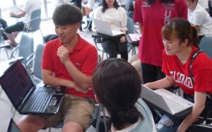 各担任の先生や2年生のチューター役の先輩たちにも入ってもらって、アドバイスをもらいます。学生や先生方は、プレゼンの中身について感想を述べたり、プレゼンの作り方や話し方について助言したりします。