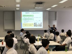 そのあと、学科長による学科紹介に続いて、模擬授業「会社での物事の決め方(組織の意思決定)」が行われました。この模擬授業では、出席された高校生と保護者の方にもコンセンサスゲームに参加していただきました。