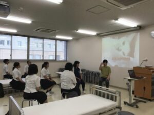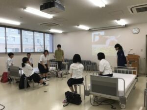 去る7月18日に三原高等学校の2年生に対して模擬授業を行いました。今回の担当は介護技術を担当する藤井准教授です。それに介護福祉コース学生もアシスタントとして入りました。