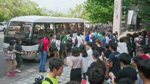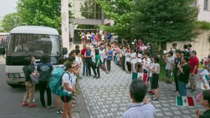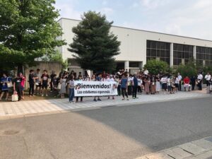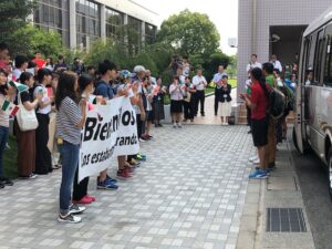 合宿初日に,スポーツクライミング選手団を多くの学生たちが歓迎しました。