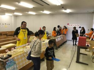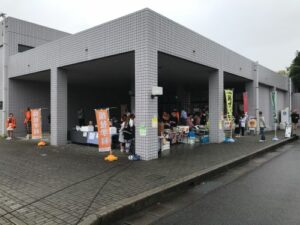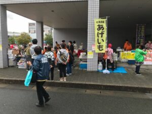 今回は、せんだんの家のパウンドケーキ、なの花作業所のクッキー、遊心工房のごぼう茶、ゆめサポート・バクのジェラート、ジョイジョイワークたかにしの揚げイモ、まどかのみたらし団子。福山共働センターの松茸ご飯と、さまざまな商品が販売されました。